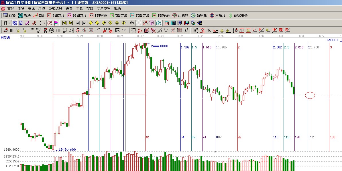 ★依據(jù)贏家江恩系統(tǒng)黃金時(shí)間周期線提示:從1949點(diǎn)至2444點(diǎn)做時(shí)間圖(3),6月7號(hào)為時(shí)間窗,下個(gè)時(shí)間窗在18、19號(hào);