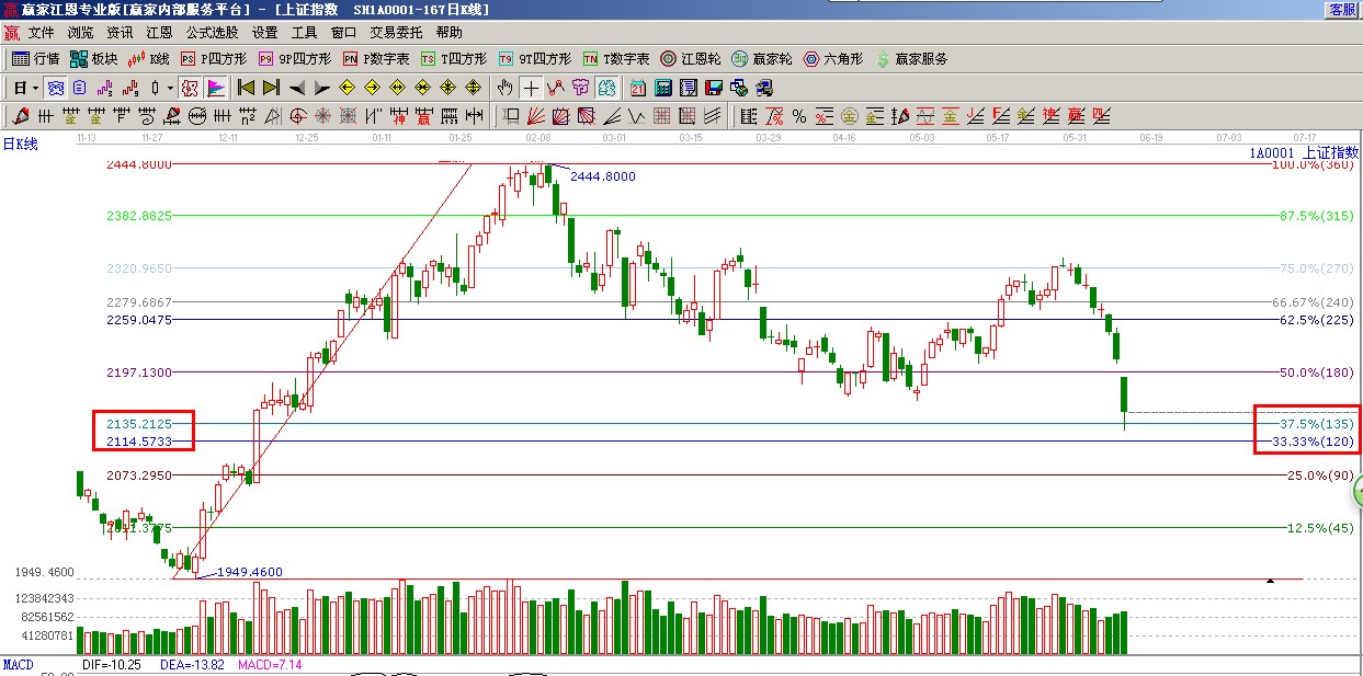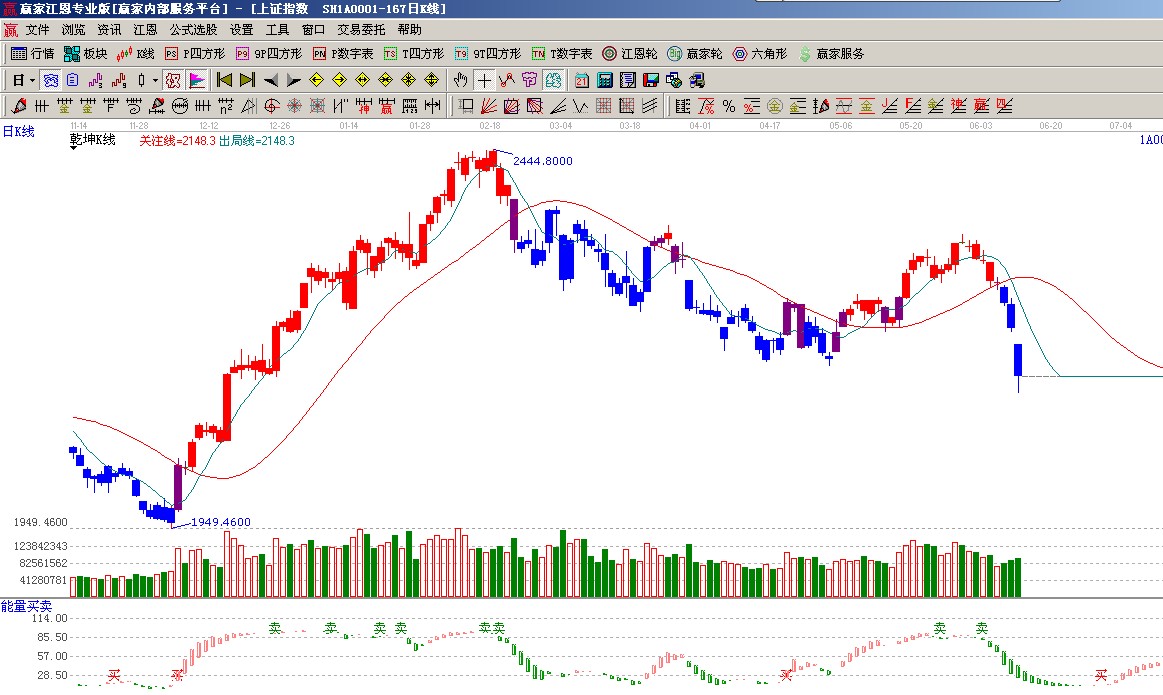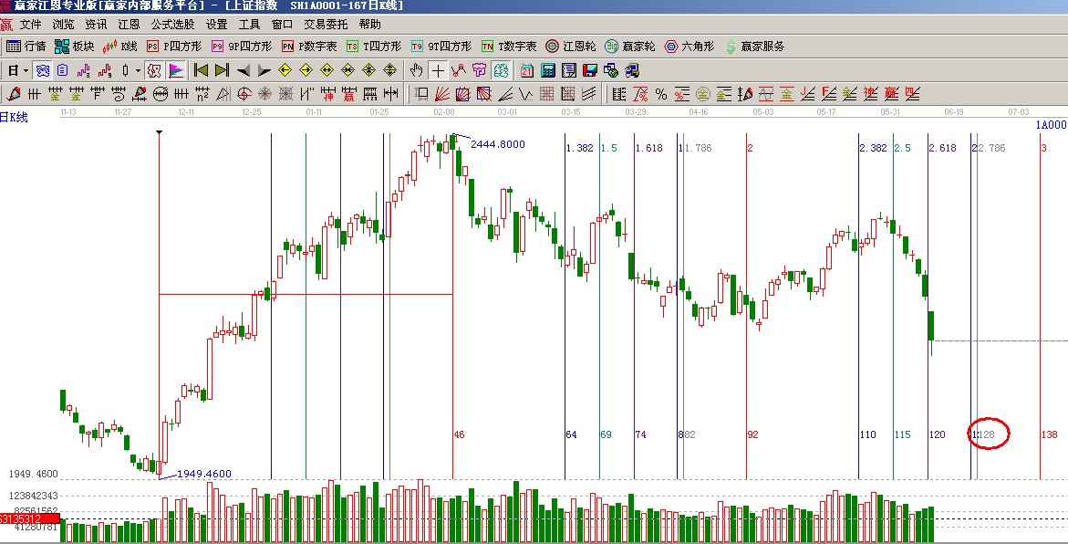★依據贏家江恩系統黃金時間周期線提示:從1949點至2444點做時間圖(3),6月7號為時間窗,下個時間窗在18、19號;