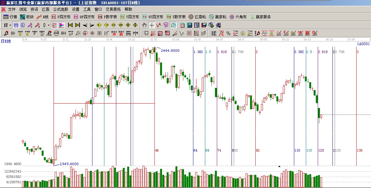 ★依據贏家江恩系統黃金時間周期線提示:從1949點至2444點做時間圖(3),分鐘圖時間窗18、19,日線時間窗21號;