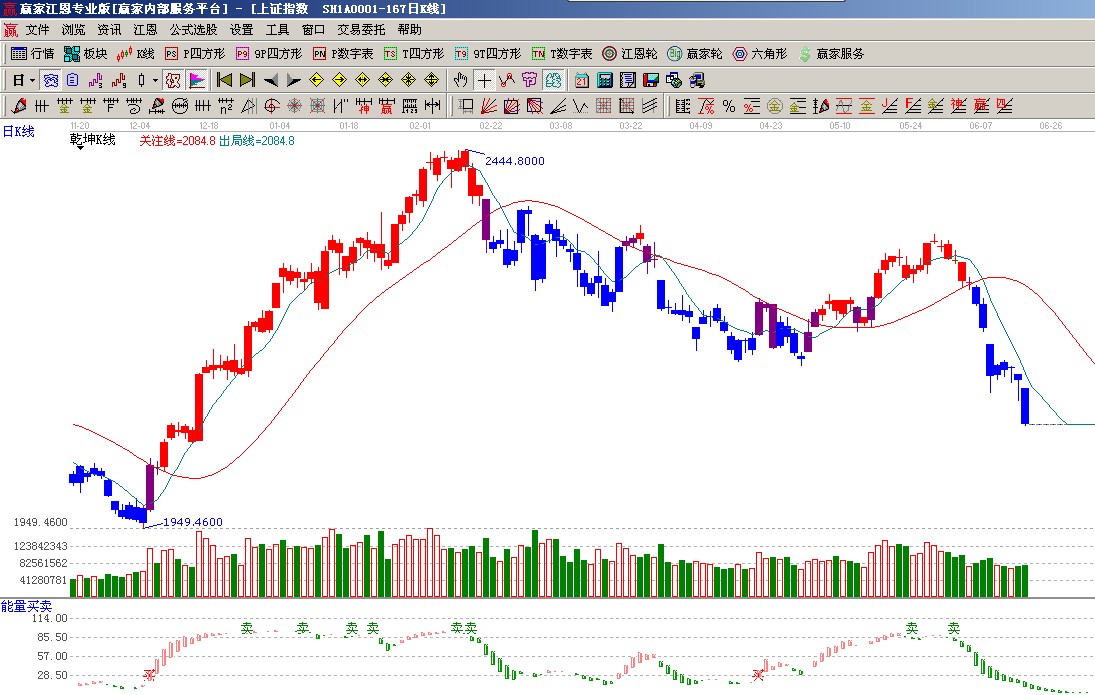 ☆依據贏家江恩系統乾坤K線提示: K線沿出局線下跌,工具在沒有提示轉勢信號前繼續看空(1);