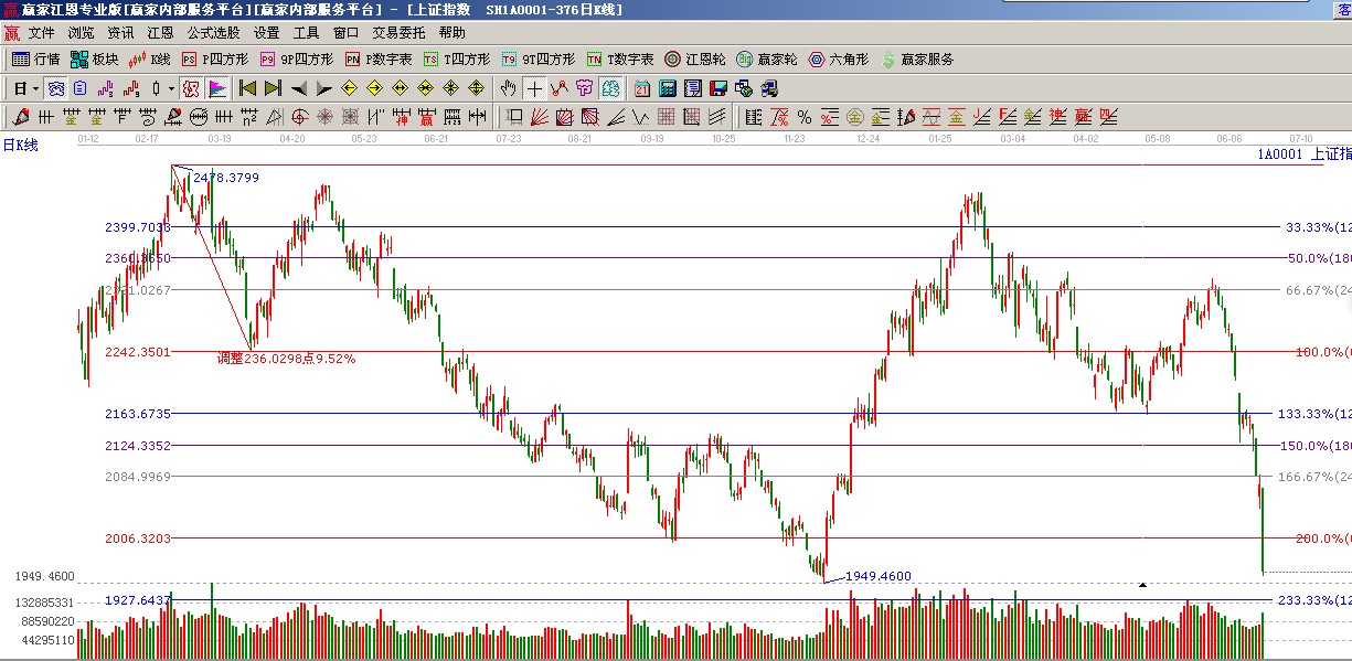 ★依據贏家江恩系統波段百分比延伸提示:自2478至2242做圖,支撐位是1949、1927、阻力位是2006;如圖(2);