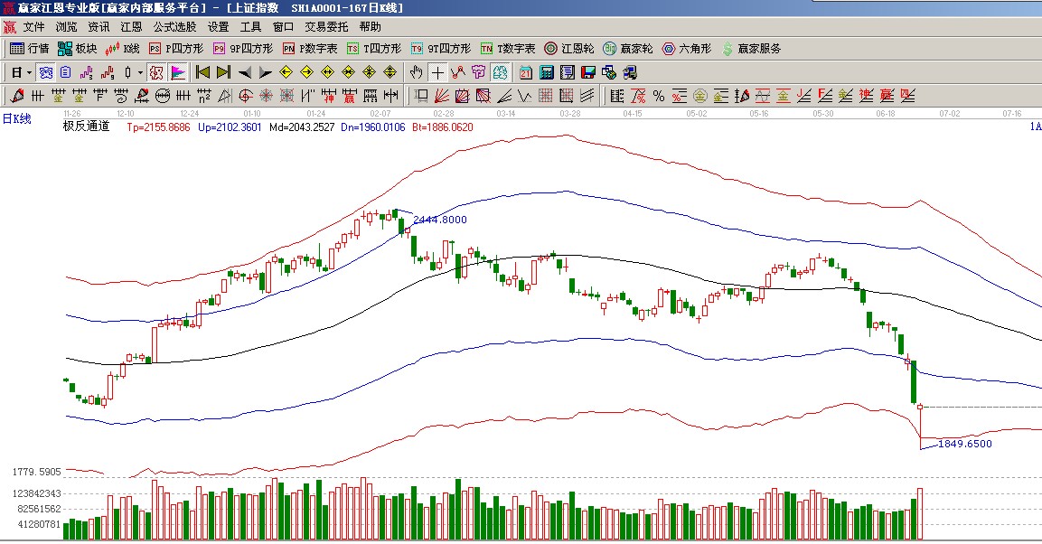 ★依據贏家江恩系統極反通道提示:今日最低點落在極弱勢外軌線上,之后護盤資金爆發,推升大盤穩步上升,從歷史走勢上來看,觸碰極外軌線一共7次,此線附近止跌啟穩做底概率很大,本次能否歷史重演,靜觀其變。