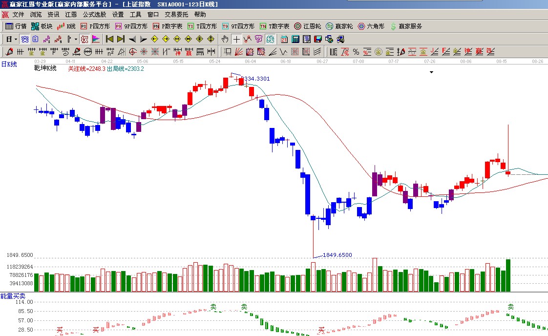 ★依據(jù)贏家江恩系統(tǒng)乾坤K線提示:K線破短線出局線,依據(jù)規(guī)則短線出局,波段減倉,等待紅色關(guān)注線(1)