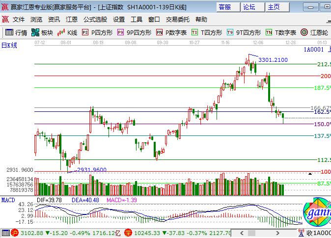 周二大盤低開一路下探至江恩百分比180度及半年線位置,尾盤權重股拉抬跌幅收窄,創業板勉強收紅。板塊方面,券商微漲,石油、銀行、保險調整拖累指數,二線藍籌表現不佳;熱點題材混亂,小部分次新、科技股超跌反彈,短股橫行,上海國改、油改、農業零跌,個股漲跌互現成交量同前日持平。技術方面,今日是大盤日線時間窗,江恩百分比180度3084點止跌回升,短周期底背離明確,此處預計展開反抽,力度能回補缺口就相當不錯了,反彈結束預計市場還延續下探,因此操作上反彈中結合所持個股情況,決定是否加的1成波段倉出掉,等待二次加倉信號,3090、3080為日內支撐,3121、3135為日內阻力,僅供參考,不構成任何投資建議。