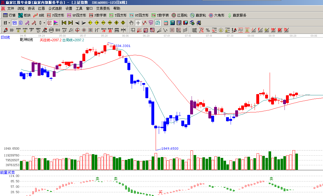 ★依據(jù)贏家江恩系統(tǒng)乾坤K線提示:k線回踩短期出局線后拉起、整體紅色K線表示看多;(1)