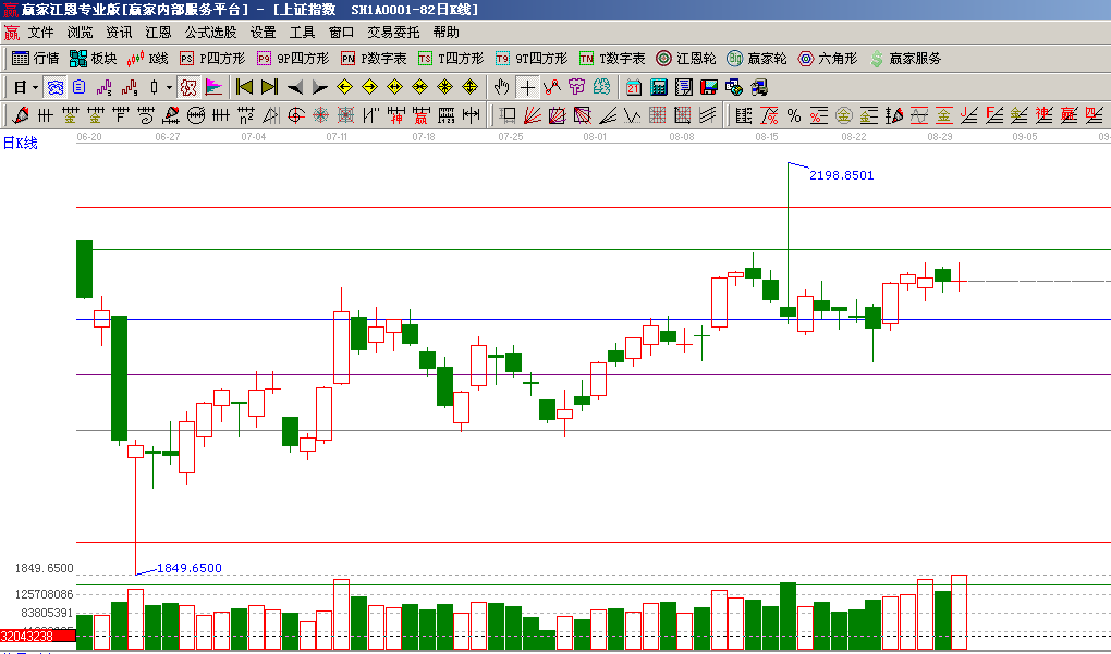 ☆依據贏家江恩系統波段百分比延伸提示:百分比45度位置是2130點位置,120度是2070點位置,K線運行在此區間下為支撐上為阻力;(2)