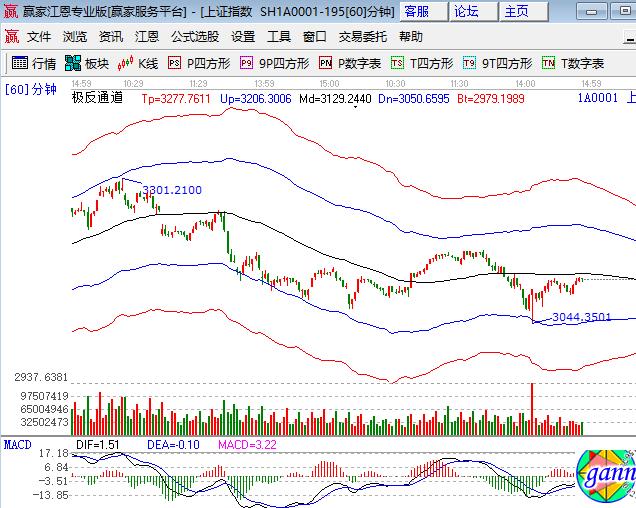 大盤上周低開高走迎來久違的中陽上漲0.7%,深成指大漲1%,創業板大漲2%,深強滬弱。板塊方面,權重僅券商勉強跑贏大盤,銀行、保險、石油權重漲幅墊底;題材方面,超跌互聯網科技股和莊股為盤中亮點,個股普漲成交量同前日基本持平。技術方面,江恩百分比零度位置3097點為強支撐,上方是45度3155點,該點位基本與極反通道生命線相重合,滬指是否結束調整進入強勢區域就看此線得失,短周期60分鐘受生命線壓制,3115、3097為日內支撐,3132、3145為日內阻力,僅供參考,不構成任何投資建議。