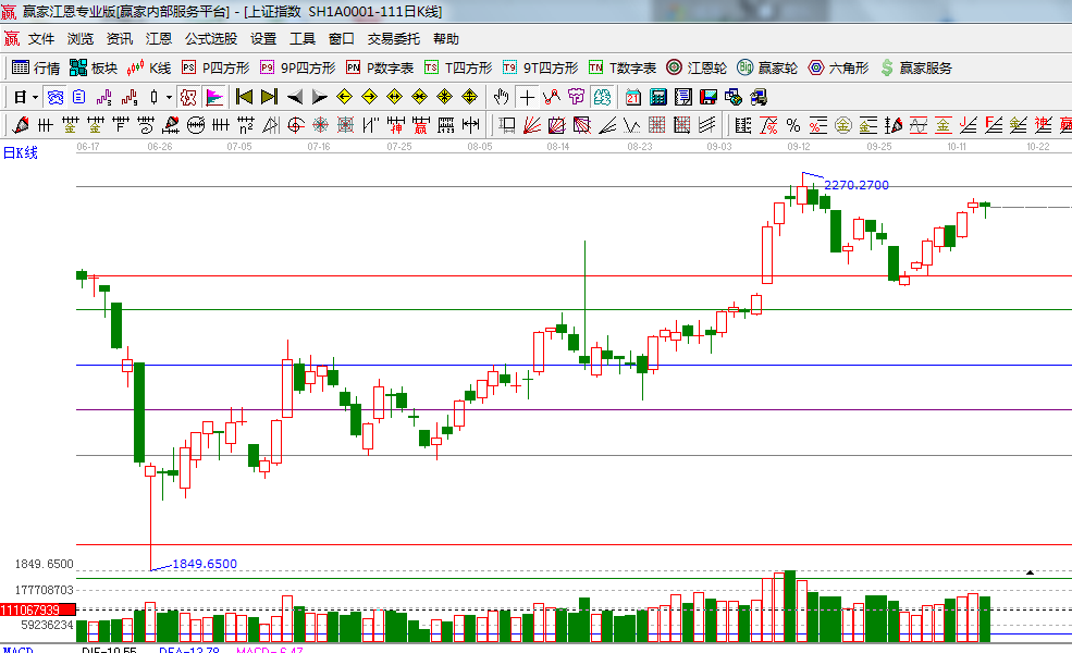 今天是日線的時間窗口,兩市圍繞日線外軌線展開震蕩整理,收陰十字星,盤面上,醫療保健,物流、電力領漲大盤,創業板個股繼續回調,權重股持續低迷,今天成交量比昨日有所減少,依據贏家江恩工具分析,短期阻力位極反通道藍色外軌線2257點,此區間市場資金表現謹慎,操作方面穩健者適當回避風險,明天延續弱勢震蕩概率偏大。