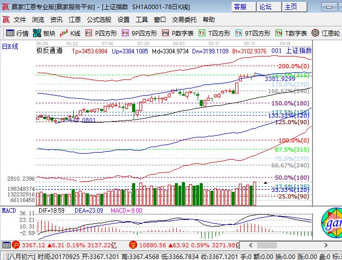 咨詢:13333833889大盤上周五高開沖高回落震蕩收陽十字星,深成指和中小創(chuàng)漲幅在0.5%以上,大于滬指漲幅。板塊方面,煤炭、鋼鐵、有色板塊領(lǐng)漲,權(quán)重僅券商跑贏大盤,銀行、保險領(lǐng)跌;題材方面,科技股國產(chǎn)軟件、人工智能、網(wǎng)安和次新表現(xiàn)不錯,周期資源股、上海國改、金磚會議走勢較弱,個股漲多跌少成交量放量突破3100量。技術(shù)方面,滬指日線收盤略高于外軌線(3365點(diǎn))2個點(diǎn),短期15分鐘收在生命線,30、60分鐘逐級向生命線靠攏,江恩百分比270度是3320點(diǎn),315度是3370點(diǎn),預(yù)計(jì)滬指繼續(xù)圍繞外軌線上下震蕩,本周回補(bǔ)下方缺口的概率較大,因此操作上不追高,等待回撤后的機(jī)會,波段倉位控制在4成,短線倉2成,3350、3340為日內(nèi)支撐,3374、3280為日內(nèi)壓力。僅供參考,不構(gòu)成任何投資建議。