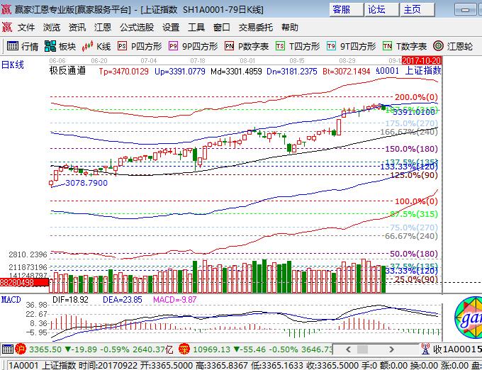 大盤周四低開低走終結四連陽下跌0.59%,創業板創新高被滬指拖累回落,深成指和中小板都有不同下跌。板塊方面,招保萬金帶動地產板塊大漲,煤炭、有色、鋼鐵和券商板塊領跌,銀行、保險、石油跌幅大于滬指;題材方面,次新、填權和裝配式建筑領跑,稀土、黃金、軟件和人工智能領跌,個股跌多漲少成交量較前日略微萎縮。技術方面,滬指日線K線收盤跌破極反通道外軌線和江恩百分比315度位置,短周期觀察盤中到60分鐘生命線承接力,相對安全的位置在120度生命線缺口附近,該位置基本上也是百分比270度線位置,操作上短線降低操作頻率,波段等待回撤有買入信號后加倉做差價,不斷刷新高,波段倉位控制在4成,短線倉2成,3350、3340為日內支撐,3376、3383為日內壓力。僅供參考,不構成任何投資建議。