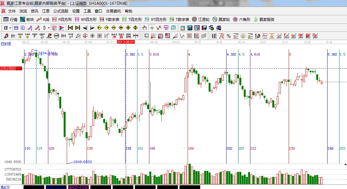 ☆依據(jù)贏家江恩系統(tǒng)波段百分比提示:跌破62.5%與66.67%區(qū)間,50%的位置是2150;