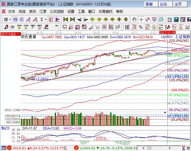 上周五大盤低開震蕩延續小漲,同時再創新高,深成指幾大指數處于綠盤小跌,其中創業板跌幅達0.76%。板塊方面,釀酒、保險、銀行板塊大漲,家電、食品和醫藥消費板塊也有表現,有色、鋼鐵、煤炭和券商領跌;題材方面,黃金、稀土永磁、高鐵、石墨烯、人工智能和房屋租賃概念領跌,個股下跌居多,成交量較前日縮量,但整體為逐漸放量。技術方面,滬指日線沖周短期阻力帶,江恩百分比零度與極反通道外軌線構成阻力帶是3420-3444點。短期走勢上周五盤中以在群中詳細進行描述,15分鐘不破生命線震蕩修復指標,帶更大的周期60分鐘受外軌線阻力時則將于日線共振,操作上此位置不在具備大幅加倉條件,前期布局的5成波段倉均有不錯的收益,短期做好波段股差主,操作頻率以盤中表現強弱決定,3404、3397為日內支撐,3420、3429為日內壓力。僅供參考,不構成任何投資建議。