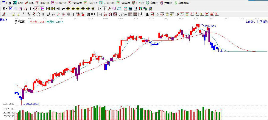 ★依據贏家江恩理論系統乾坤K線提示:紅色關注線之下,k線由紫色轉變為藍色線,依據規則,趨勢空頭。