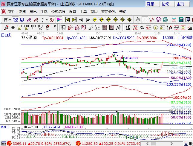 周三滬指低開震蕩延續上漲態勢,權重與藍籌依然是主力軍,深市幾大指數走勢更強,漲幅均在1%以上。板塊方面,券商領漲權重,有色、石油、銀行輪番表現,保險和煤炭走勢較弱;題材方面,雄安一枝獨秀領漲概念股,5G、新能源汽車、太陽能、芯片局部表現,次新和免疫治療逆勢下跌,個股分化將成為常態,熱點切換快為反彈埋下隱患。技術方面,滬指日K線放量上行至江恩百分比315度受阻,同時觸及短周期60分鐘極反通道外軌線,連續四天的上攻短周期有反復確認的動作,關注位昨日盤中已提示15分鐘生命線處,日K線能保持在生命線上運行,MACD指標則有望被拉回零軸上方,具體看橫盤回踩時的狀態;創業板觀察生命線糾纏后的走勢,主線依然在大市值企業上。操作策略上波段4成倉持股不動,短線倉3成可以開始操作,3357、3348為日內支撐,3380、3385為日內壓力。僅供參考,不構成任何投資建議。
