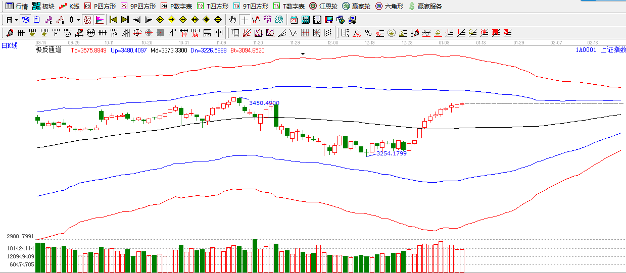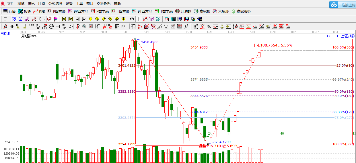 江恩看盤綜述:依據贏家江恩技術工具分析得出:周五,滬指再次日線新高,量能持續縮小,自10日窗口之后量能持續縮小,是制約指數空間的主要因素。指數整理甚至回調的需求逐步提升。短期還是建議逢高逐步減倉,謹防出現急速的下跌。支撐依舊關注3400點,3380點附近,1月時10日之后,下一個窗口是1月22日附近。操作上,繼續關注成長性良好的超跌股以及個股的年報行情。