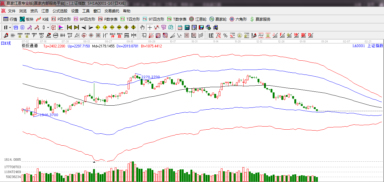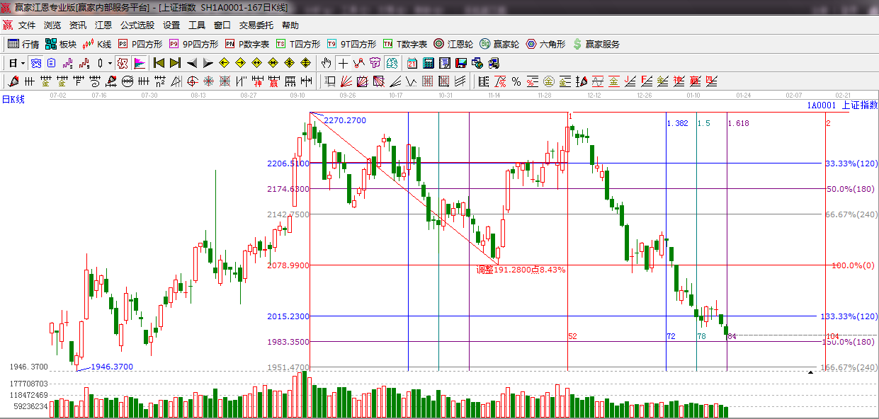 綜上所述:依據贏家江恩技術工具分析得出:今日指數如期回落至弱勢下軌線和180度線支撐位置,量能進一步萎縮,而且今日是日線的1.618倍的時間窗口,短期支撐1983點附近此位置不破將會有一個震蕩整理的過程,等待探底后的量能恢復,操作上以輕指數重個股為主,激進者嚴格控制倉位,穩健者耐心等待。星級風險提示,看空(依據物極必反原理,看空不做空)