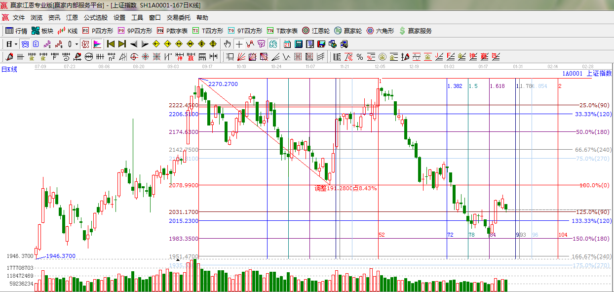 綜上所述:依據(jù)贏家江恩技術(shù)工具分析得出:滬深兩市弱勢走低,回探江恩90度支撐2031點,關注此位置得失,此位置不破。后市有望在短暫調(diào)整后繼續(xù)沖高,本周時間之窗12月30(黃金分割0.764)操作方面,結(jié)合工具規(guī)則,倉位保持5成,星級風險提示,謹慎看多。