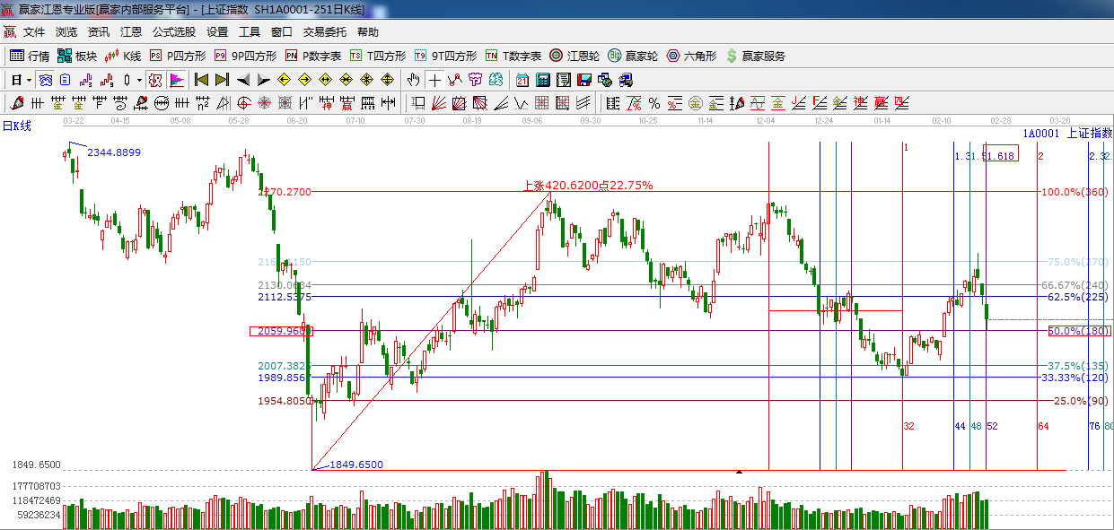 綜上所述:依據(jù)贏家江恩技術(shù)工具分析得出:昨日在房地產(chǎn)的利空打壓下,指數(shù)失守生命線,短期弱勢(shì),最終在江恩180度位置止跌(1849-2270波段),預(yù)計(jì)明日將圍繞此支撐震蕩整理,關(guān)注極反通道生命線的爭(zhēng)奪,上線則整體上升趨勢(shì)不變,繼續(xù)破線下行,調(diào)整時(shí)間將進(jìn)一步加長(zhǎng),操作上,結(jié)合情況適當(dāng)降低倉位,謹(jǐn)慎為主。星級(jí)風(fēng)險(xiǎn)提示,謹(jǐn)慎看多。