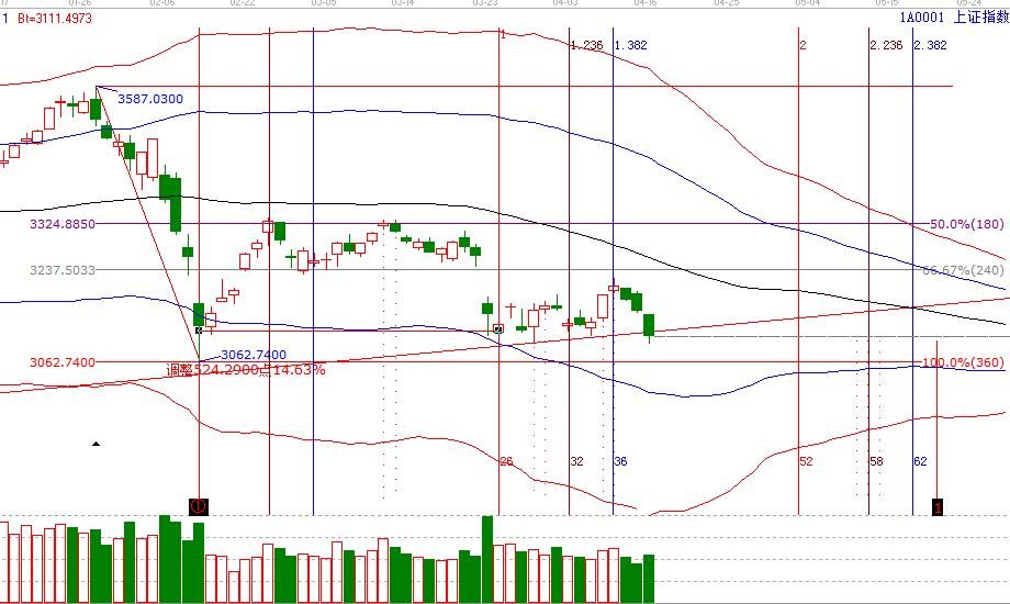 ①滬指短周期滬指15分鐘觸及紅色極弱通道線,30分鐘觸及弱勢外軌線,市場如橫盤則會鈍化極反通道幾條線;日線破90度3126點,45度是3077點,這條線破位則大盤將回到另外一個循環中。