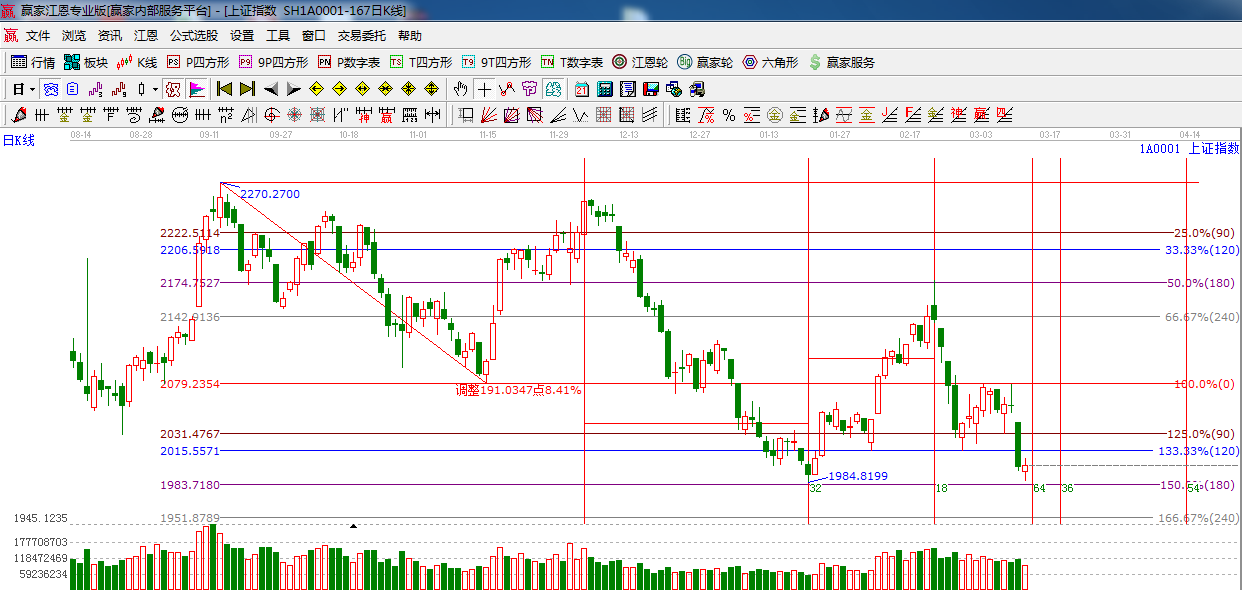 ★依據(jù)贏家江恩系統(tǒng)波段百分比提示:今日在支撐180度位置1984點附近,止跌反抽,明日反抽阻力位2015點,90度2031點,下方支撐180度位置1984點附近,240度位置1951點附近。