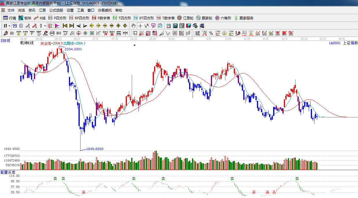 ☆依據(jù)贏家江恩系統(tǒng)乾坤K線提示:藍(lán)色休息區(qū),出局線下方,依據(jù)規(guī)則休息為主,波段看空。