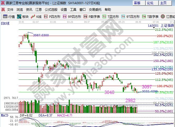大盤破3040成為常態化,但所有收盤都在此點位上方,這也是多方操盤手使用贏家江恩系統百分比的緣故,明白失守一線看低一線原則,通過多次下破提前釋放恐慌情緒,遵守工具信號,百分比315度3040不破上看零度位置3097點,下破則是270度2982點。