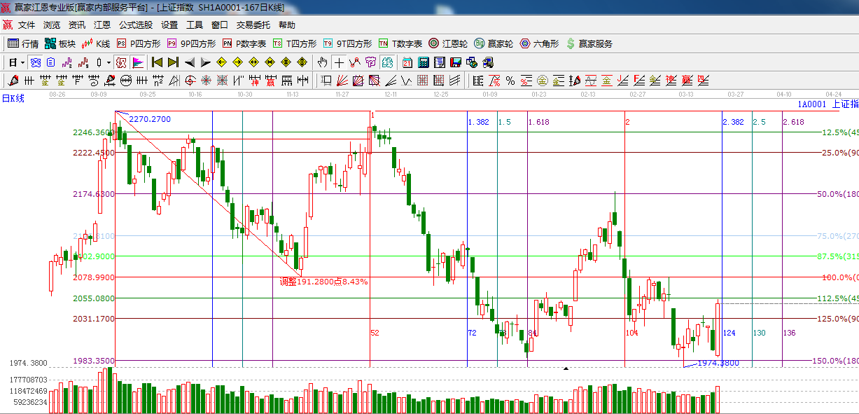 綜上所述:依據贏家江恩技術工具分析得出:在銀行,地產等權重集體拉升下,底部出現標志性放量單陽,轉變了近期的連續的疲弱表現,關注后期板塊的輪動效應及量能的跟隨,是底部確認的關鍵性因素,操作上,適當加大倉位,謹慎看多。星級風險提示,看多。