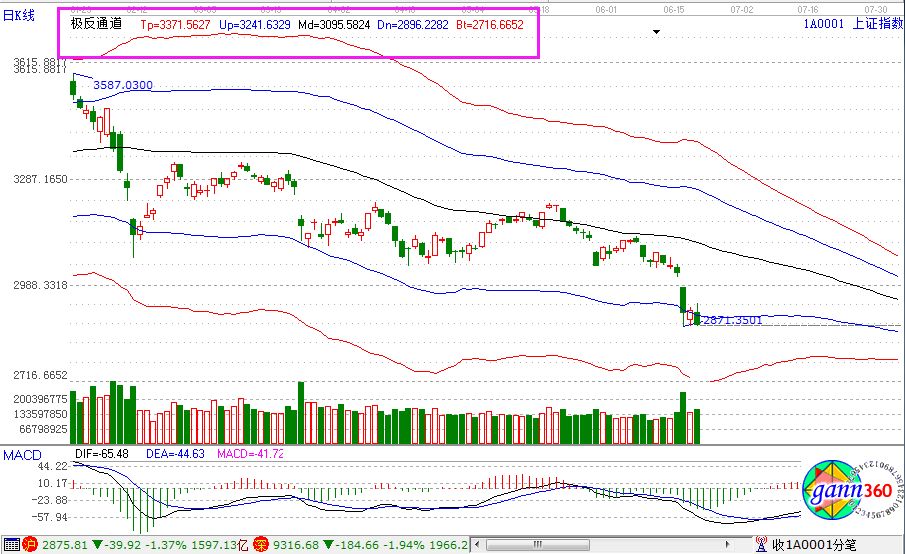 滬指跌1.37%,報收2875點;深成指跌1.94%,報收9316點;創業板跌2.69%,報收1521點。盤面上看,煤炭、鋼鐵、酒店餐飲等少數板塊上漲;集成電路、芯片、半導體、5G、網絡安全、人臉識別等板塊跌幅居前。全天,滬股通凈流入4.2億元,深股通凈流出12億。相應的極反通道指標的支撐壓力提示,如下圖所示: