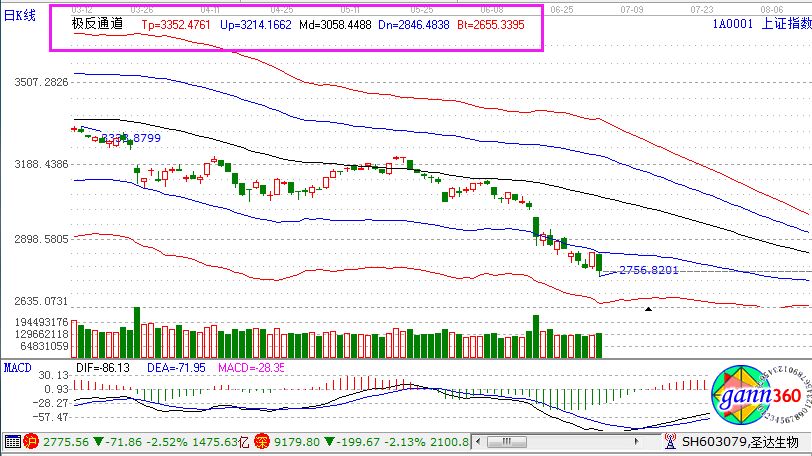 滬指跌2.52%,報(bào)收2775點(diǎn);深成指跌2.13%,報(bào)收9179點(diǎn);創(chuàng)業(yè)板跌1.14%,報(bào)收1588點(diǎn)。從盤面上看,海南、食品安全、分散染料等少數(shù)板塊飄紅;粵港澳大灣區(qū)、煤炭、鋼鐵、租售同權(quán)、證券、銀行、房地產(chǎn)等板塊跌幅居前。相應(yīng)的極反通道指標(biāo)的支撐壓力提示,如下圖所示: