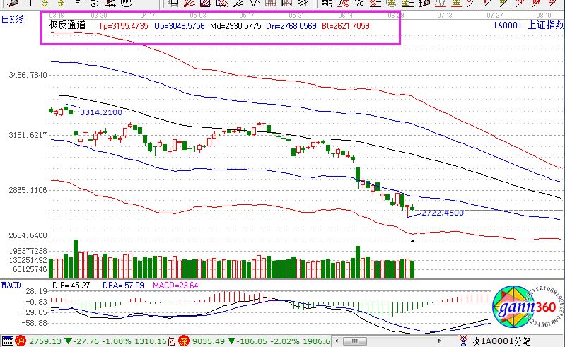 滬指跌1.00%,報2759點;深成指跌2.02%,報9035點;創業板指跌2.58%,報1565點。盤面上看,機場航運、鋼鐵、黃金、農林牧漁、深圳國資改革等板塊漲幅居前;次新股、網絡安全、海南、紡織制造、數字中國、人臉識別等板塊跌幅居前。滬股通凈流出2.8億,深股通凈流出10億。相應的極反通道指標的支撐壓力提示,如下圖所示: