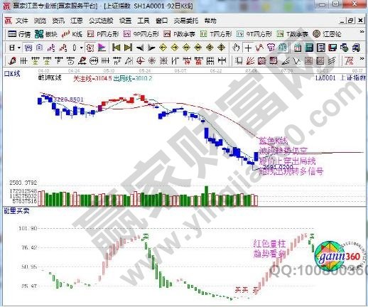 ☆依據贏家江恩理論系統乾坤K線提示:藍色K線,波段趨勢仍為空;股價突破出局線,短線出現轉多信號。