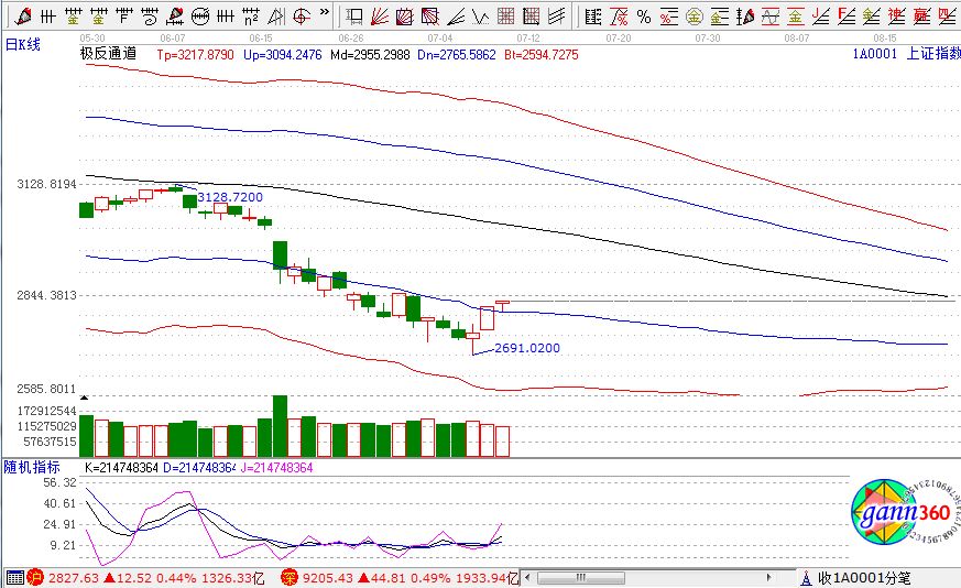 滬指漲0.44%,報2827點;深成指漲0.49%,報9205點;創業板指漲0.70%,報1592點。盤面上看,高送轉、次新股、水泥、石油開采、機場航運、鈦白粉、鋼鐵等板塊漲幅居前;農業股、國產軟件、網絡安全、互聯網彩票、銀行、保險等板塊跌幅居前。滬股通凈流入5億,深股通凈流入2.6億。相應的極反通道指標的支撐壓力提示,如下圖所示: