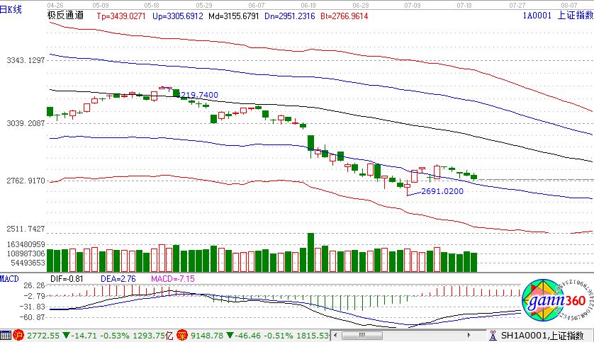 滬指跌0.53%,報(bào)收2772點(diǎn);深成指跌0.51%,報(bào)收9148點(diǎn);創(chuàng)業(yè)板跌1.11%,報(bào)收1590點(diǎn)。從板塊漲幅上看,鋼鐵、高送轉(zhuǎn)、水泥、尾氣治理等少數(shù)上漲;農(nóng)業(yè)、機(jī)場(chǎng)航運(yùn)、在線旅游、海南、黃金等板塊跌幅居前。滬股通凈流入18億,深股通凈流入8.7億。相應(yīng)的極反通道指標(biāo)的支撐壓力提示,如下圖所示: