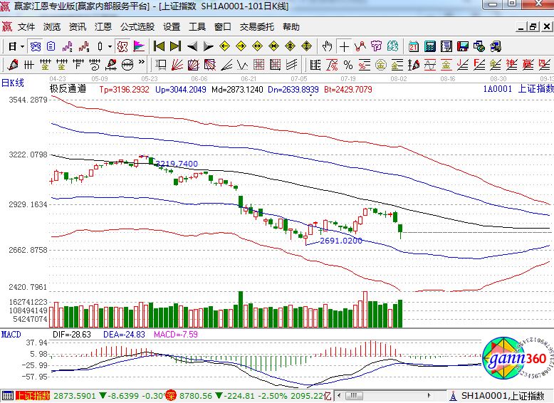截止收盤,滬指跌2.00%,報2768點;深成指跌2.50%,報8780點;創業板指跌2.06%,報1510點。盤面上看,水泥、新疆、西藏、鋼鐵、農業等少數板塊上漲;深圳國資改革、軍工、環保工程、電子競技、互聯網彩票、美麗中國等板塊跌幅居前。滬股通凈流入8.9億,深股通凈流出2億。相應的極反通道指標的支撐壓力提示,如下圖所示: