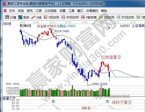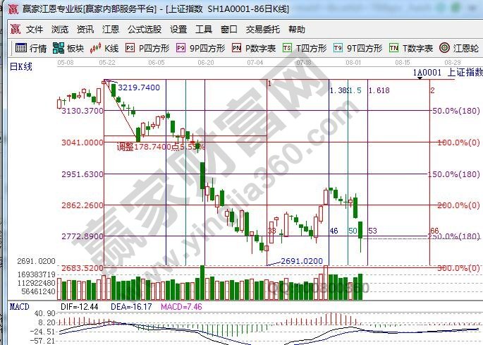 江恩看盤綜述:通過江恩理論系統趨勢、時間、價格工具綜合評判市場一星看多(五星評級標準)。大盤日線受生命線反壓下跌向藍色下軌線尋找支撐,短周期15、30、60分鐘時價共振是下跌途中的暫緩信號;空間上,江恩百分比延伸線顯示,連續兩日市場擊破零度、180度對應的2862點、2772點,2772點反復不能收復則直逼新低; 時間上,日線時間點是明天及下周一,周線時間窗是8月16,大盤月線極反通道藍色下軌線是2680附近,等待時間窗口是否與價格形成共振,在此期間多看少動,弱勢行情下本金安全是第一位。