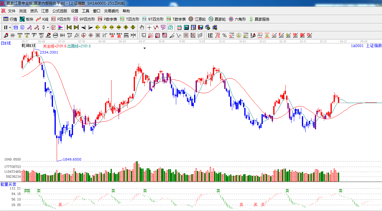 ☆依據贏家江恩系統能量買賣提示:處于紅色柱子轉入綠色柱子的臨界點,并出現“賣”字信號,短線 看空。