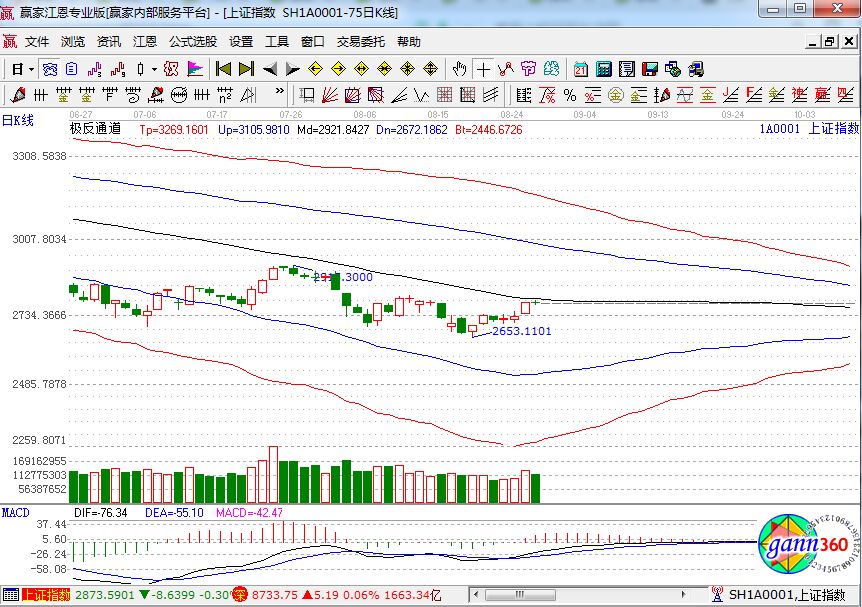 滬指下跌0.11%,報收2777點;深成指上漲0.06%,報收8733點;創(chuàng)業(yè)板下跌0.02%,報收1493點。從盤面上看,分散染料、在線旅游、量子通信等板塊漲幅居前;杭州亞運會、公交、可燃冰等板塊跌幅居前。滬股通凈流入6.34億,深股通凈流入9.84億。相應的極反通道指標的支撐壓力提示,如下圖所示: