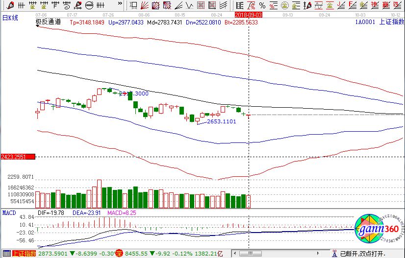 滬指跌0.17%,報收2720點;深成指跌0.12%,報收8455點;創業板漲0.59%,報收1443點。從盤面上看,電子發票、軍工、養殖業、國產軟件、食品安全、新疆、互聯網彩票等板塊漲幅幅居前;高送轉、機場航運、5G、ST板塊、汽車整車、電子制造等板塊跌幅居前。滬股通凈流出1.7億,深股通凈流入5.8億。相應的極反通道指標的支撐壓力提示,如下圖所示: