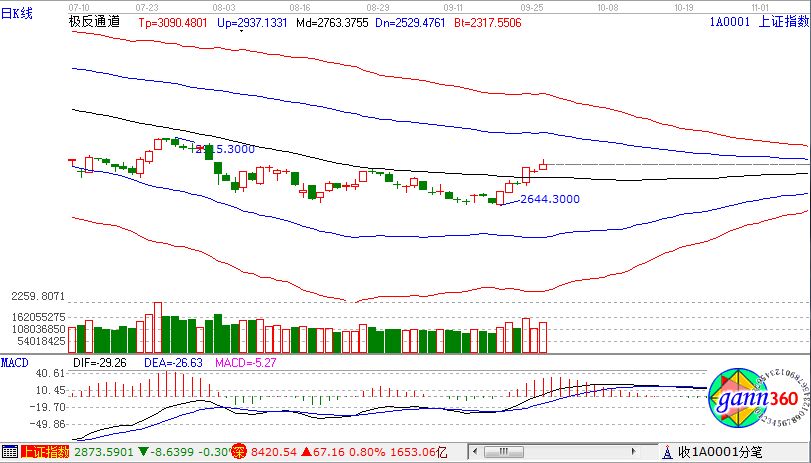 滬指漲0.92%,報收2806點;深成指漲0.80%,報收8420點;創業板漲1.06%,報收1420點。從盤面上看,物流、白酒、食品飲料、醫藥商業、油改、醫療器械等板塊上漲;種植業、氟化工、足球概念、互聯網彩票、鈦白粉、知識產權保護、軍工等板塊跌幅居前。滬股通凈流入15億,深股通凈流入6億。相應的極反通道指標的支撐壓力提示,如下圖所示: