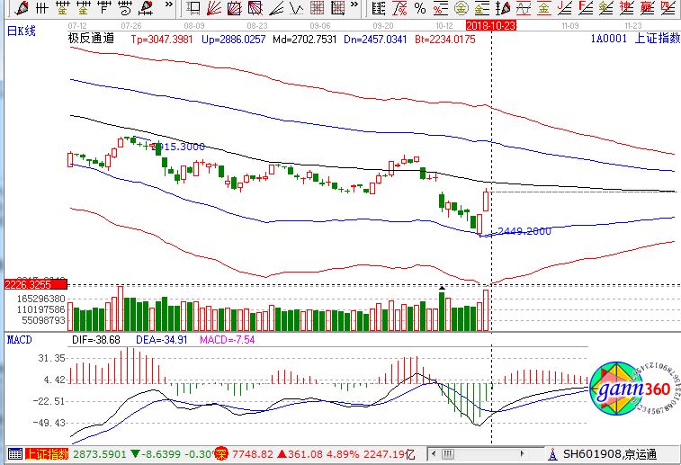 受周末利好消息刺激,A股今日全線走強(qiáng),滬指放量大漲4%,再現(xiàn)百點(diǎn)長(zhǎng)陽(yáng),一舉站上10日線,近200只個(gè)股漲停,券商更是迎來(lái)罕見漲停潮。滬指上漲4.09%,報(bào)收2654點(diǎn);深成指上漲4.89%,報(bào)收7748點(diǎn);創(chuàng)業(yè)板上漲5.2%,報(bào)收1314點(diǎn)。從盤面上看,券商、保險(xiǎn)、蘋果概念等板塊漲幅居前,兩市無(wú)一板塊下跌,全線大漲。市場(chǎng)成交量明顯放大,兩市成交額超過(guò)4000億元。滬股通凈流出8億,深股通凈流入3.4億。相應(yīng)的極反通道指標(biāo)的支撐壓力提示,如下圖所示:
