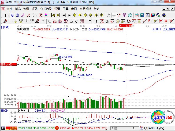滬指漲2.57%,報收2654點;深成指漲3.34%,報收7938點;創業板漲3.26%,報收1372點。盤面上看,白酒、智能音箱、量子通信、期貨概念、知識產權保護、5G等板塊漲幅居前。滬股通凈流入89億,深股通凈流入37億。相應的極反通道指標的支撐壓力提示,如下圖所示: