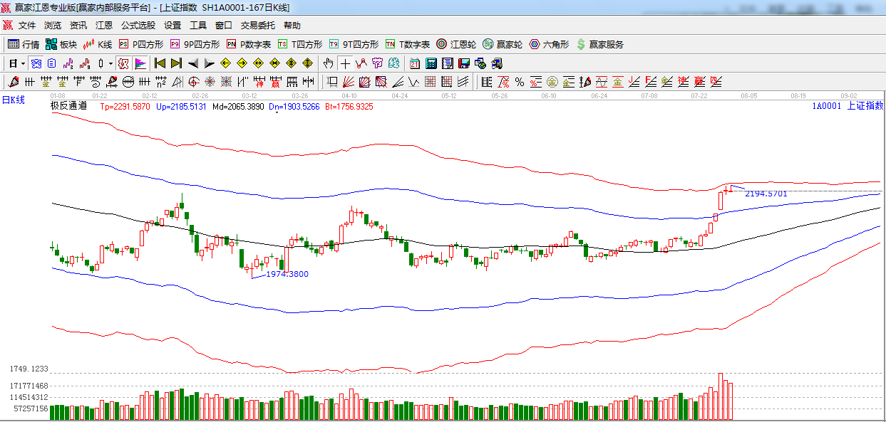 極反通道提示:逼近紅色外軌阻力線,震蕩收星,預計短期大盤將沖高回落。