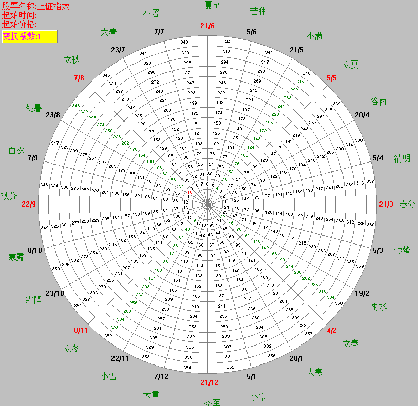 如果股價(jià)或指數(shù)較大或較小不能在360數(shù)的輪中輪顯示,則可以選擇適當(dāng)?shù)淖儞Q系數(shù),將股價(jià)或指數(shù)進(jìn)行變換使其對應(yīng)輪上的一個數(shù)字,這個數(shù)字是用紅色表示的。