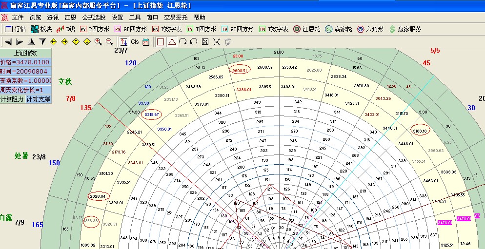 輪中輪的使用方法不在此敘述,我們以上證指數(shù)3478點(diǎn)來做分析,查看歷史上已知以及未來有可能成為重要高低點(diǎn)的位置;