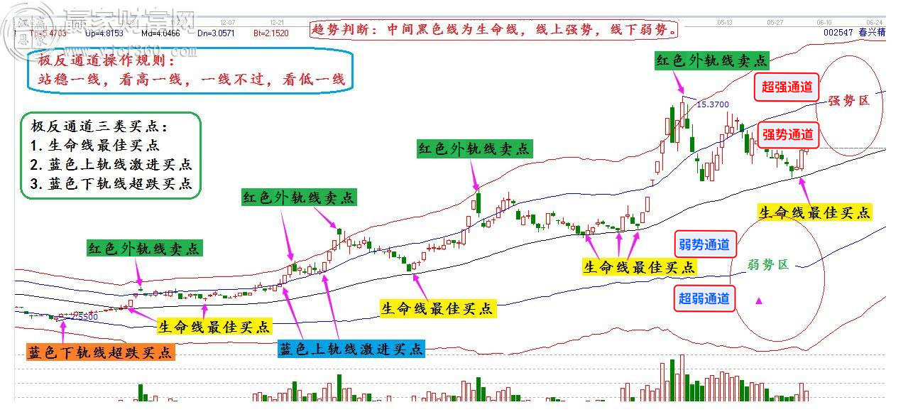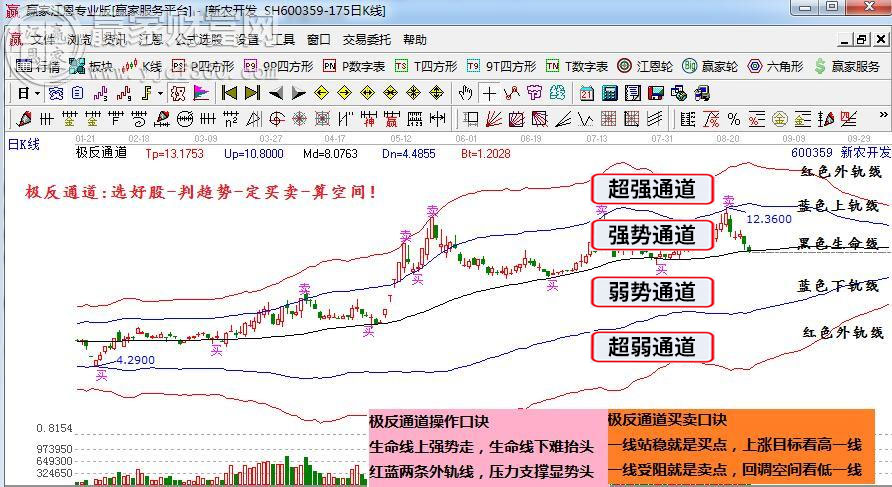 1.判斷趨勢:極反通道中間的黑色線,稱為生命線。依據股價與生命線的關系:股價在生命線以上,則股票強勢可以操作;股價在生命線以下,則股票弱勢暫不考慮。生命線是一個強勢股票的啟動點,所以贏家建議優先考慮生命線附近的股票,有強勢股不做弱勢股。