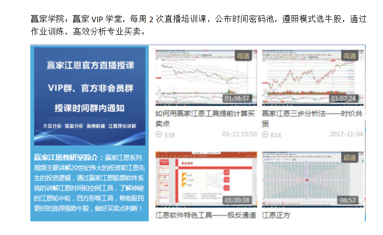贏家培訓班,以系統的國學知識、江恩知識為理論基礎、以《江恩理論---實戰應用體系》一書為教學藍本、以"贏家老子時空周期證券分析軟件"為專業工具、以"贏家江恩VIP教研室"為學習平臺,通過持續不斷的實戰應用學習,幫助學員解決3大操作難題:1.如何選出強勢好股;2.如何計算買賣位置;3.如何預測時間變盤點,從專業視角解讀市場,提前做好交易計劃。同時,結合資金管理和心態紀律培訓,克服人性弱點,打造專業的散戶,真正做到順勢而為,在股市中持續穩健的獲利。