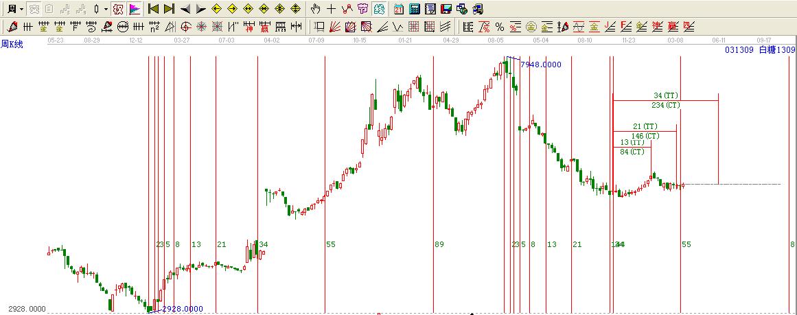 白糖1309合約7978下跌至5150以來后經行了為期55周的下跌。55是斐波那契數列中的一個數字,而在其2012-09-28低點5150是其33周的下跌,僅僅誤差了1周。如果以2012-09-28低點5150為起點,那么高點在其2013-03-11周提前一周,然后開啟了一個調整。目前也走過了21時間窗口。下一個時間窗口在其34時間周期。2702如果用心去研究你會發現更為奇異的事情,白糖1309合約周線2008-12-13日低點2928點到期7948高點來調整的時間144周剛好坐落于周2012-09-28低點5150白糖1309合約周線時間窗口變盤在即,日線級別也非常的巧妙:白糖1309至2012-09-26日低點2150以來,每一次的低點都在不斷的抬高上方在其5480構成了較為重要的壓力位置。
