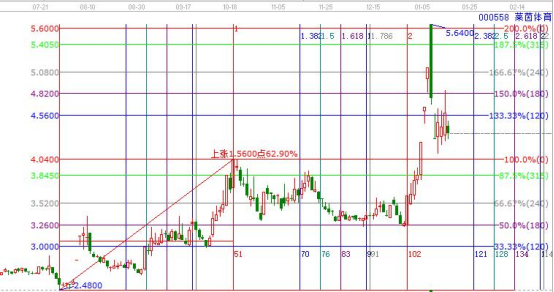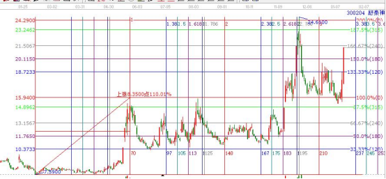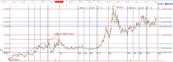 圖中選定股票的特定波動空間后,會對未來股價的拐點產生共鳴。這個特定的波動空間就是該股本輪空間波動的原始循環波動率(在美國的詞典中波動還有一層解釋是感應、共鳴)。