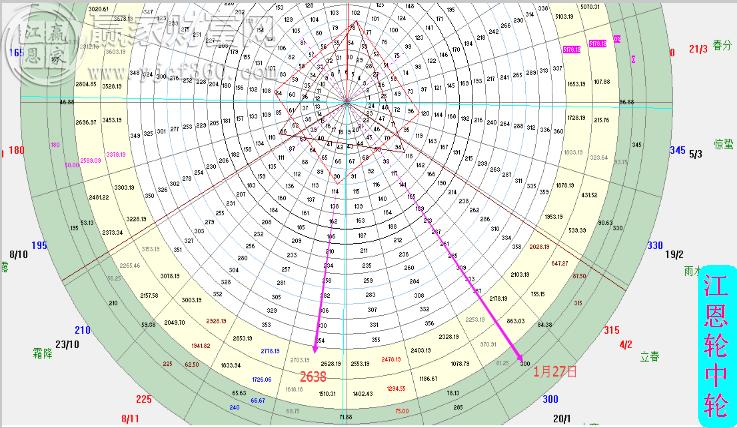 打開一只個股的K線圖。首先,借助江恩百分比等價格工具畫圖,可以得到橫著的價格線;接著,借助黃金周期線等時間工具畫圖,可以得到豎著的時間線。在贏家江恩軟件中,橫著的線為支撐壓力線,豎著的線為時間變盤點。當橫著的線和豎著的線相交叉,即為時價共振點。當運行到時價點時,結合具體的走勢和成交量,進一步確定是買入還是賣出。當然,我們也可以直接使用江恩箱、角度線或者輪中輪,一個工具直接完成時空分析。見下圖。